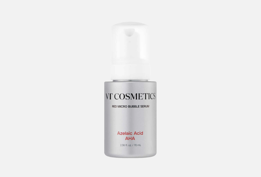 Пузырьковая сыворотка VT Cosmetics Az AHA Red Micro Bubble Serum отшелушивает и смягчает текстуру кожи, выравнивает тон и сокращает воспаление. Регулирует выработку себума, препятствует образованию комедонов и осветляет сальные нити. Устраняет тусклость, снижает выраженность пигментации и постакне. Обладает антиоксидантным свойством, защищает от негативного воздействия внешних факторов. Поддерживает оптимальный уровень увлажнения и придаёт лицу здоровое сияние.